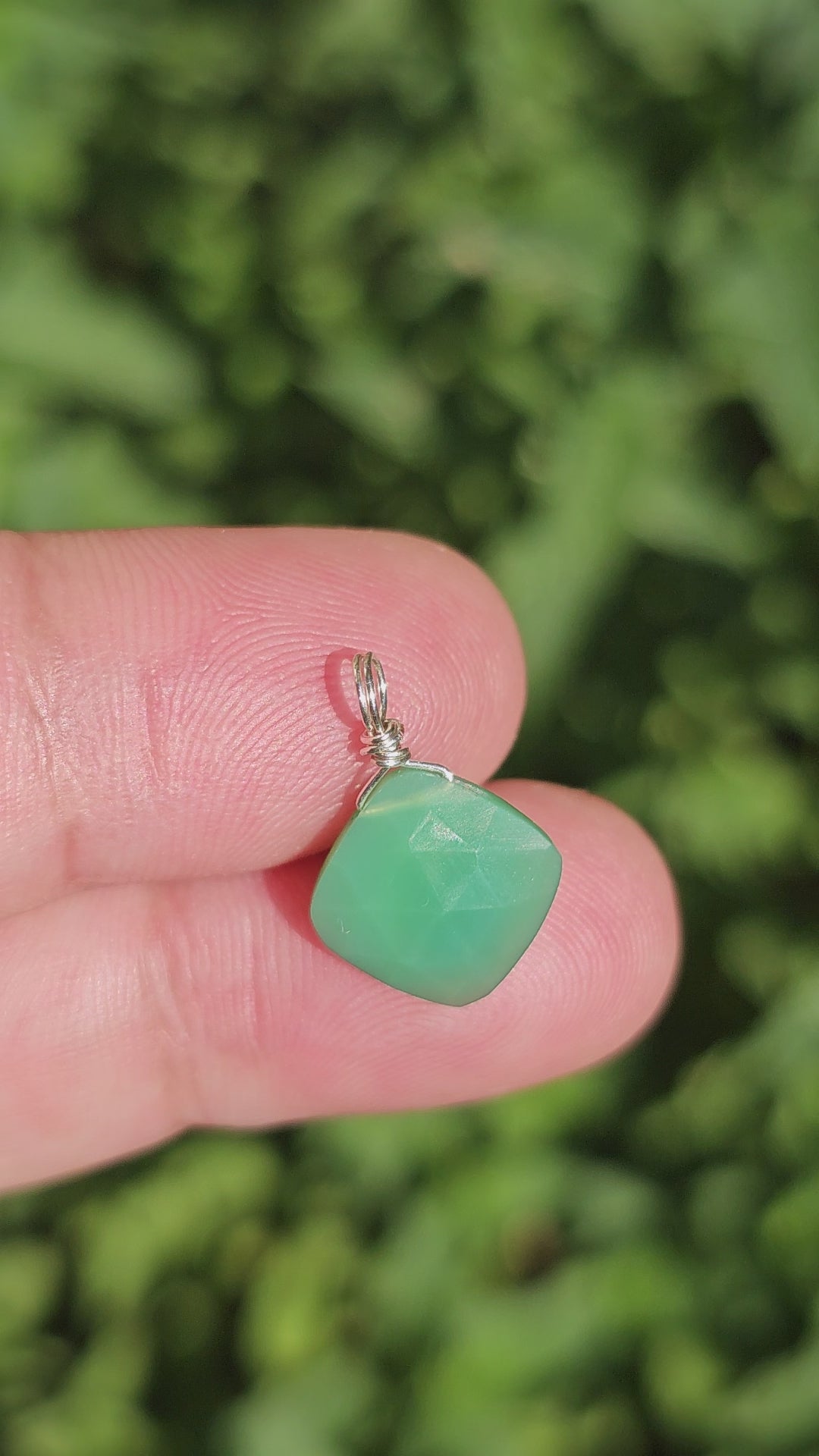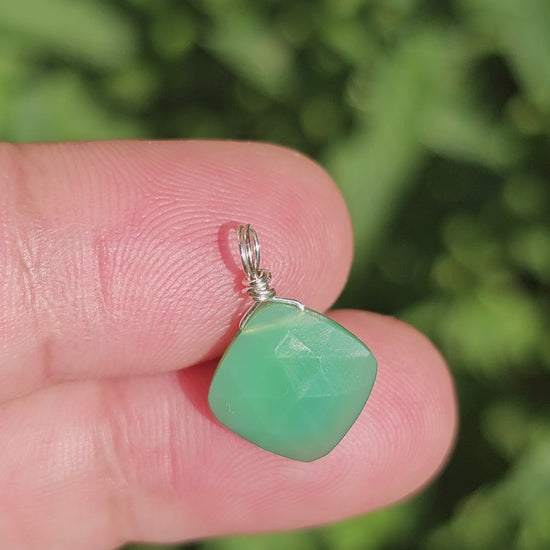 This pendant showcases an apple-green faceted Chrysoprase, which is delicately wire-wrapped and suspended from a stainless steel cable chain.