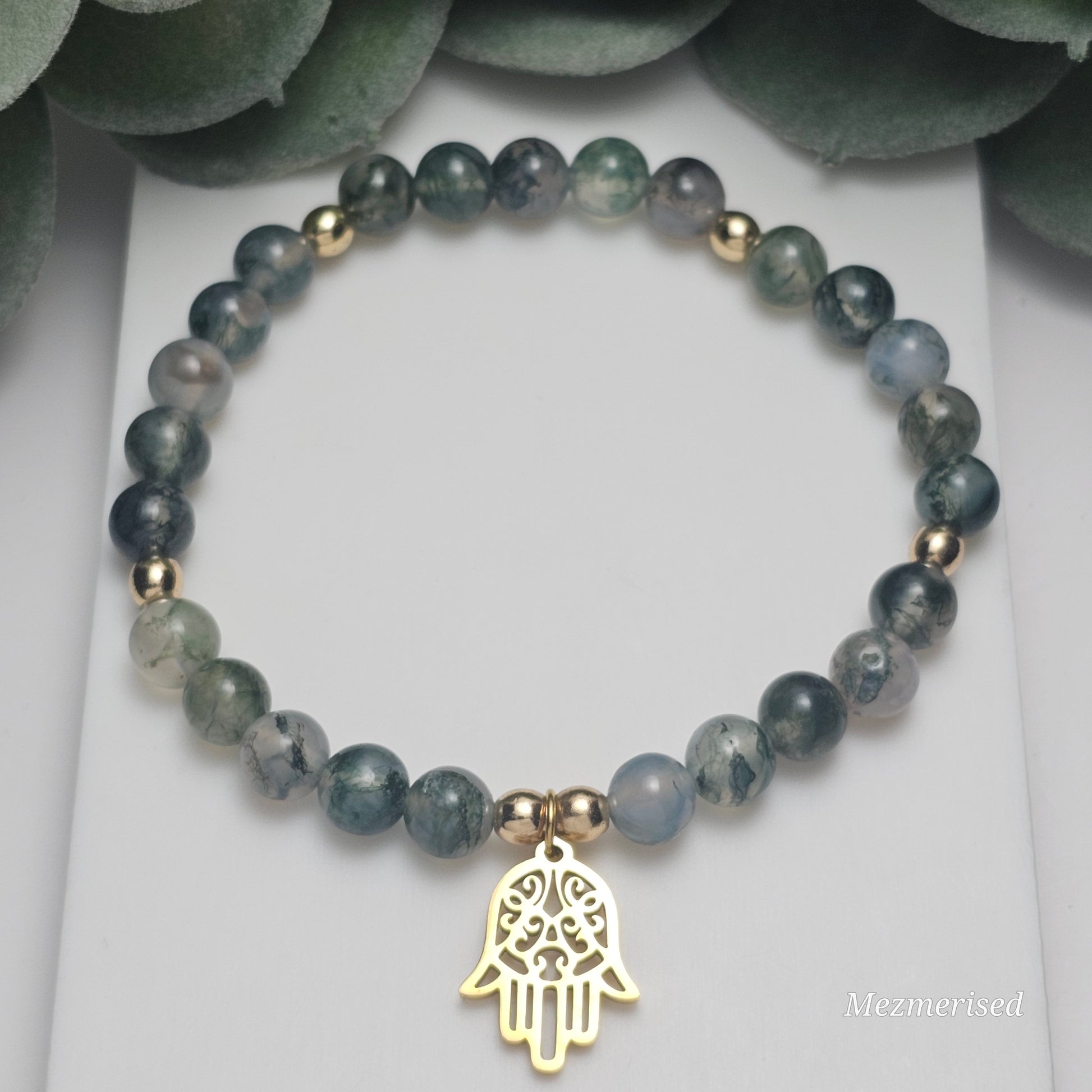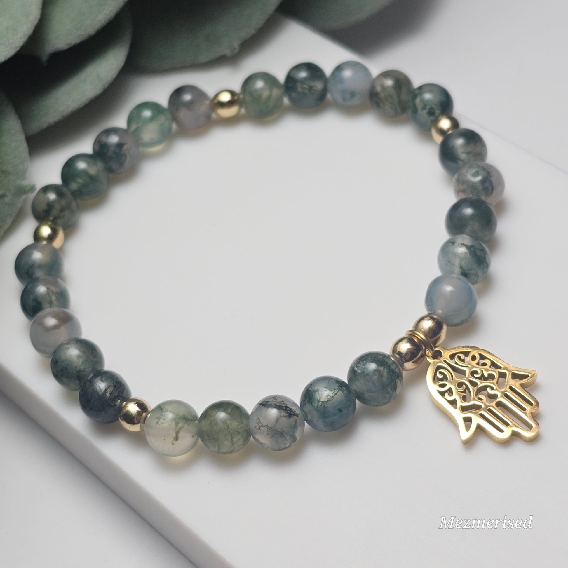 6mm A grade Moss Agate and gold or silver plated Hematite bead stretch bracelet with your choice of charm.