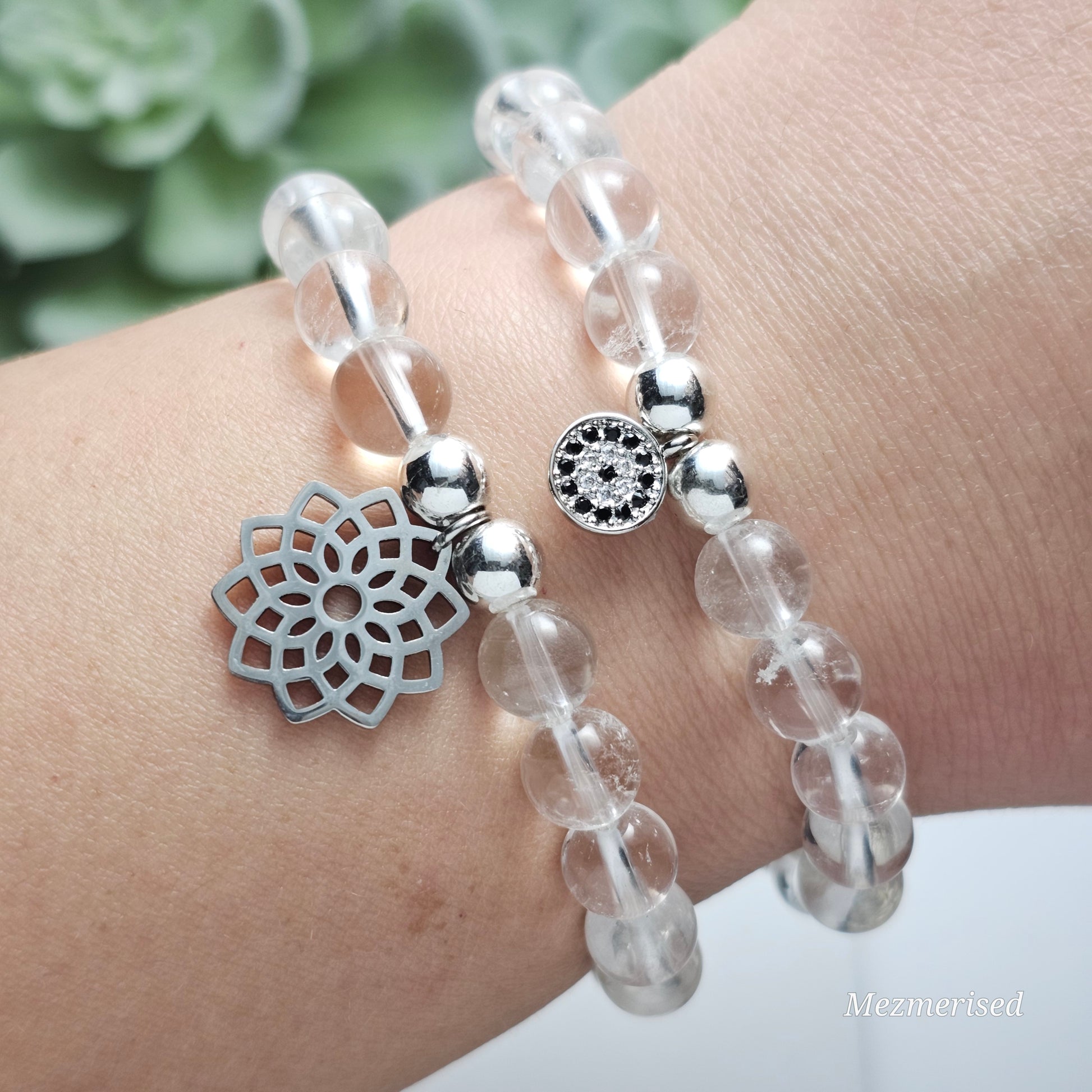 8mm A grade Clear Quartz and gold or silver plated Hematite bead stretch bracelet with your choice of charm.