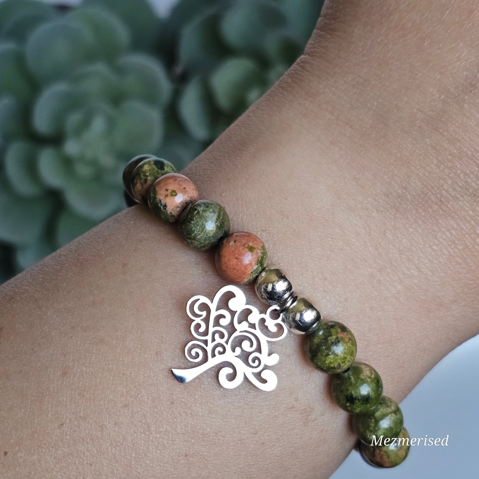 8mm Unakite and gold or silver plated Hematite bead stretch bracelet with your choice of charm.