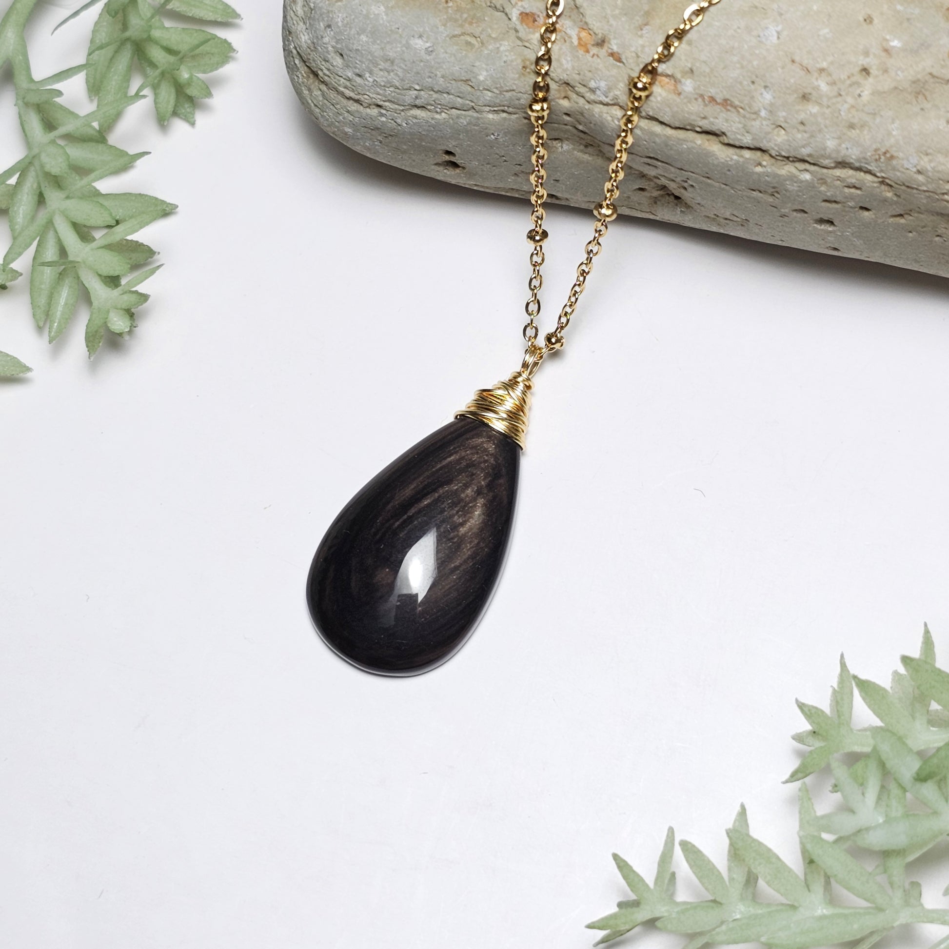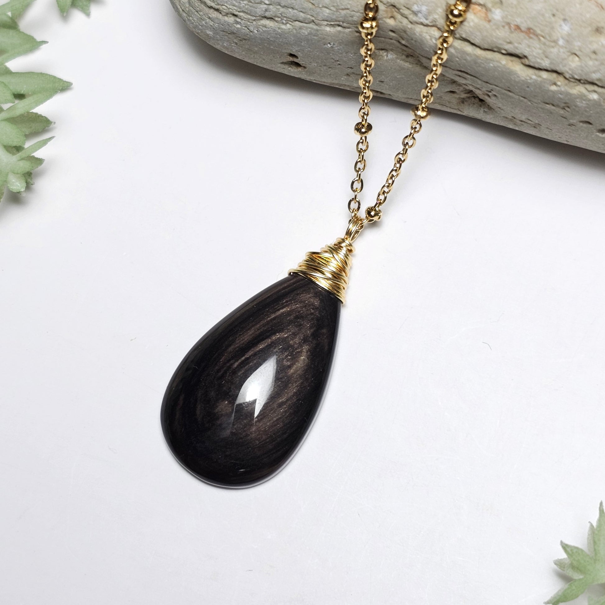 This one-of-a-kind pendant showcases a radiant Gold Sheen Obsidian stone, which is delicately wire-wrapped and suspended from an elegant golden stainless steel satellite chain.