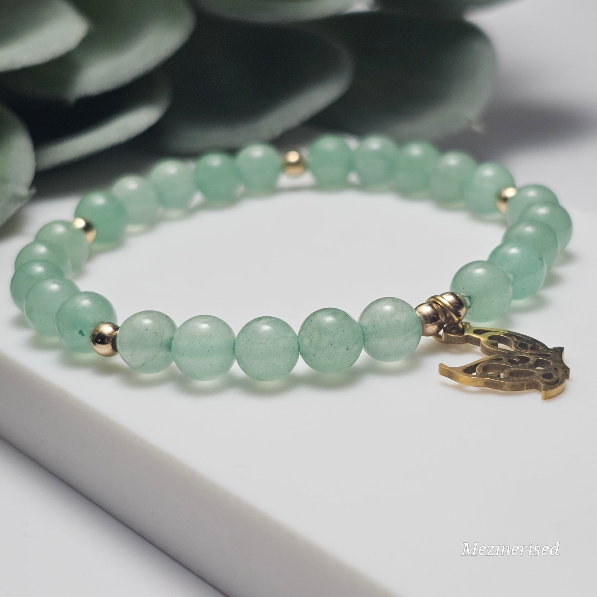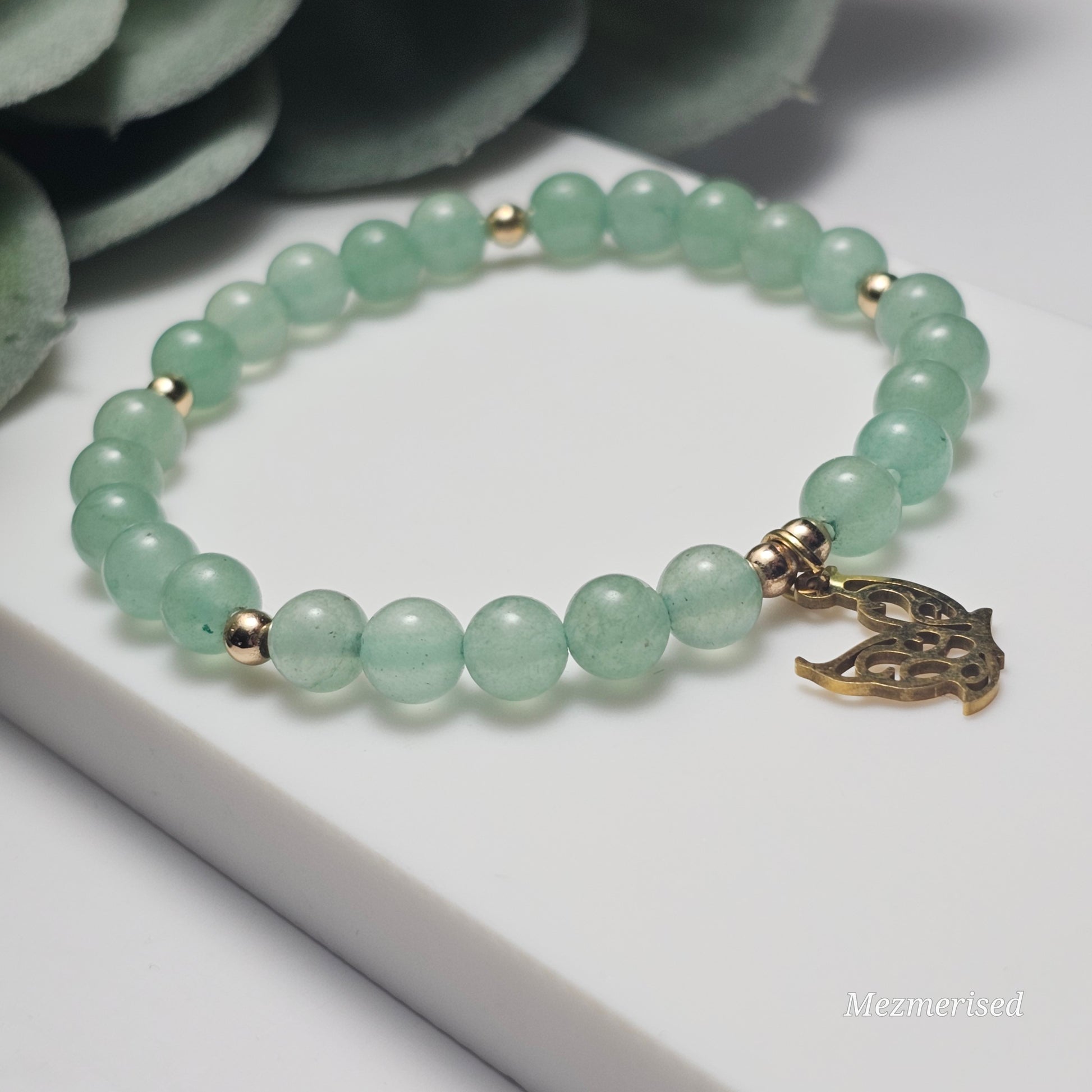 6mm Green Aventurine and gold or silver plated Hematite bead stretch bracelet with your choice of charm.