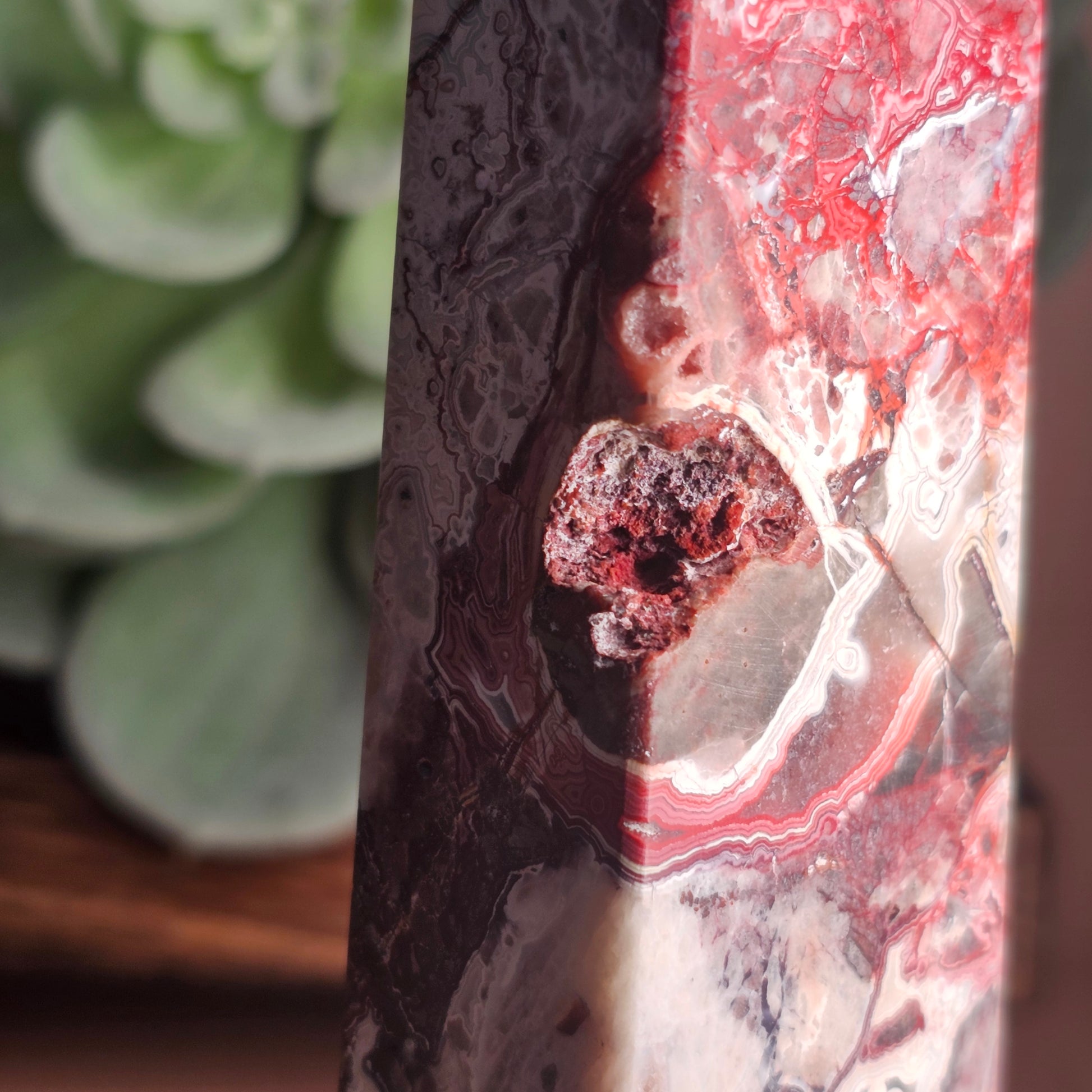 Beautiful Mexican Crazy Lace Agate with many druzy pockets. This mesmerising piece has incredible personality with intricate bright red, grey and white banding.