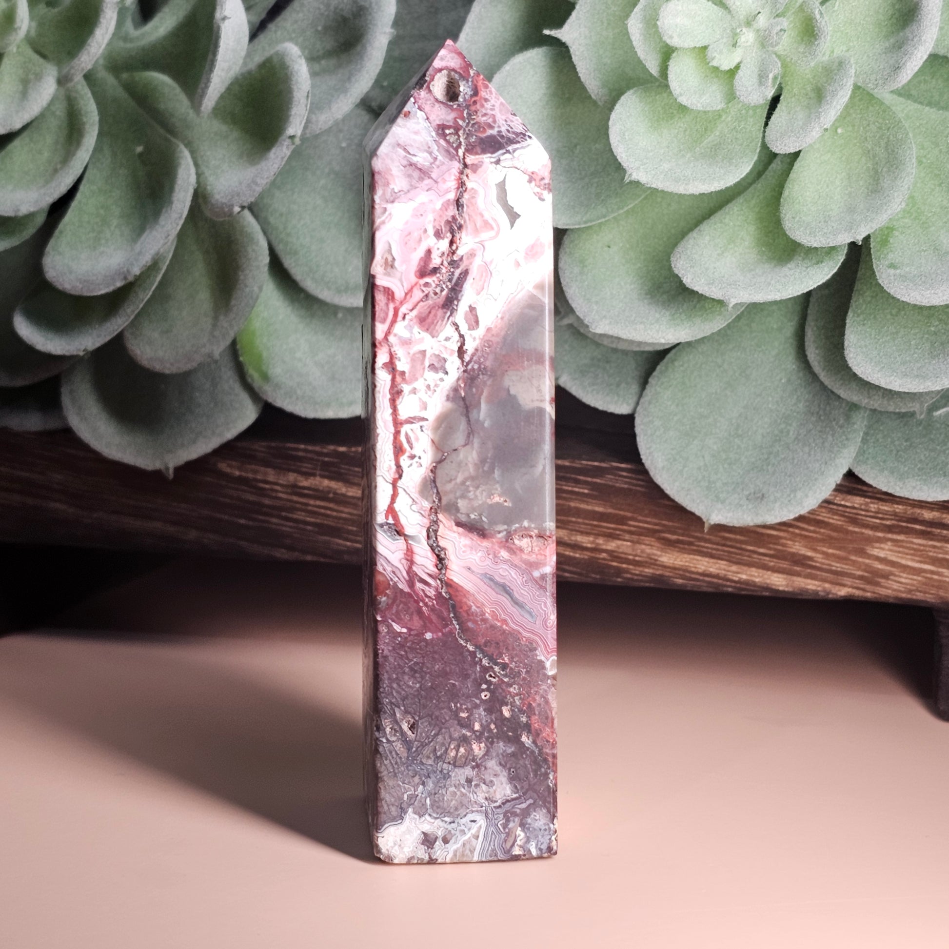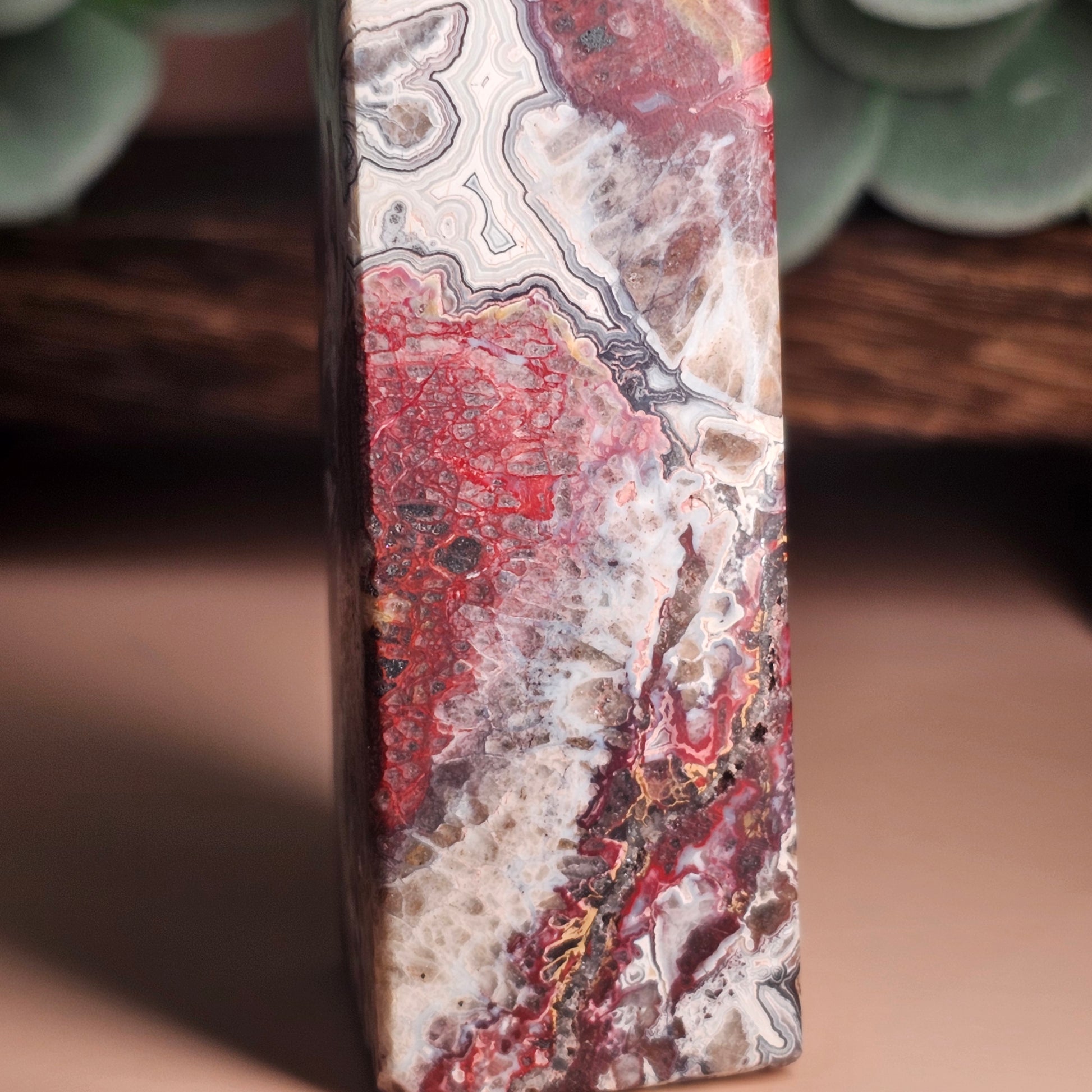 Beautiful Mexican Crazy Lace Agate with many druzy pockets. This stunning piece has amazing character with its white and grey banding, vibrant red and deep grey veining, and small deposits of yellow throughout.