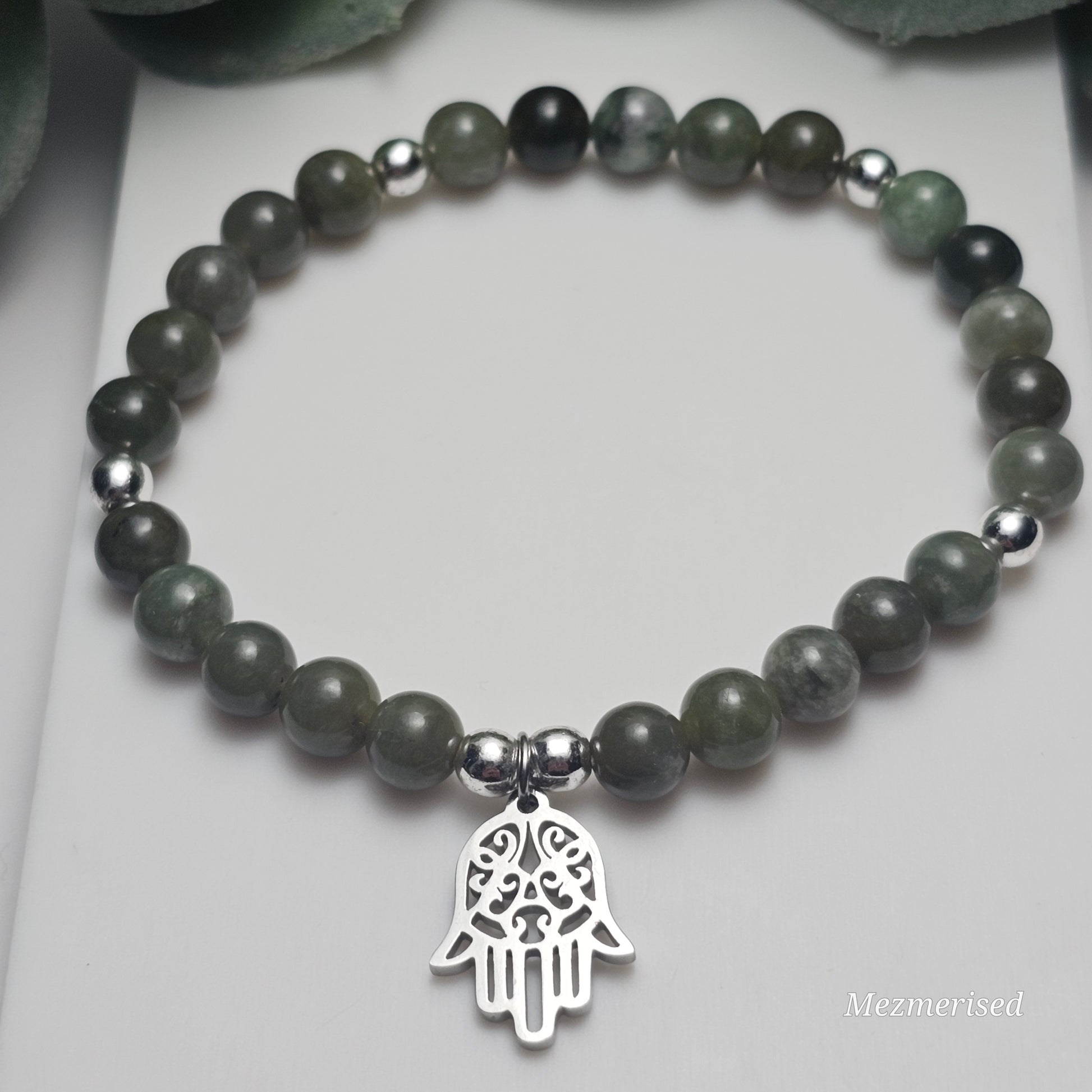 6mm Xiuyan Jade and gold or silver plated Hematite bead stretch bracelet with your choice of charm.